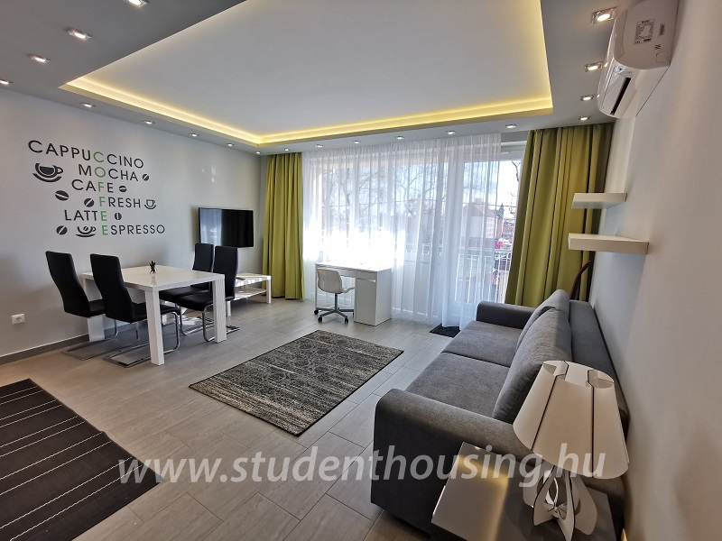 Egyetemvárosban kiadó egy új építésű társasházban, egy 59 nm-es, 3 szobás, dupla erkélyes téglalakás. A lakásban egy tágas amerikai konyha+nappali, két külön nyíló hálószoba, előszoba, fürdőszoba és WC külön helyiségben található. A nappaliból közelíthető meg a nagyobbik erkély, ahol egy kerti bútor kapott helyet, még a kisebbik erkély az egyik hálószobából nyílik, és egy csendes, belső udvarra néz. A lakás teljes körűen bútorozott és felszerelt. Mosógép, szárítógép, mosogatógép és inverteres klíma is található a lakásban. Igény szerint fedett udvari gépkocsibeálló is bérelhető, amelynek ára 15.000 Ft havonta. Dohányozni és állatot tartani a lakásban nem lehet!